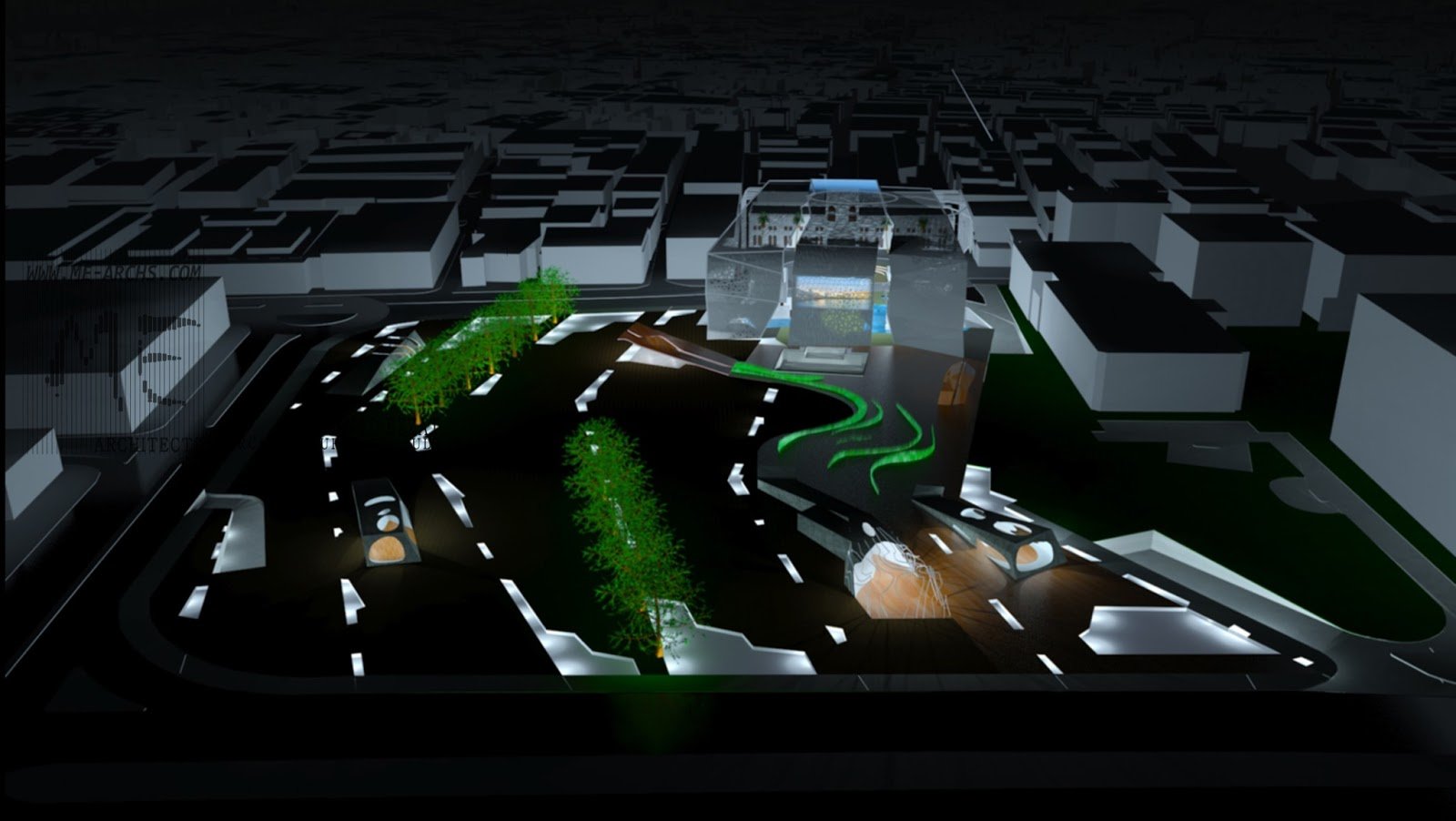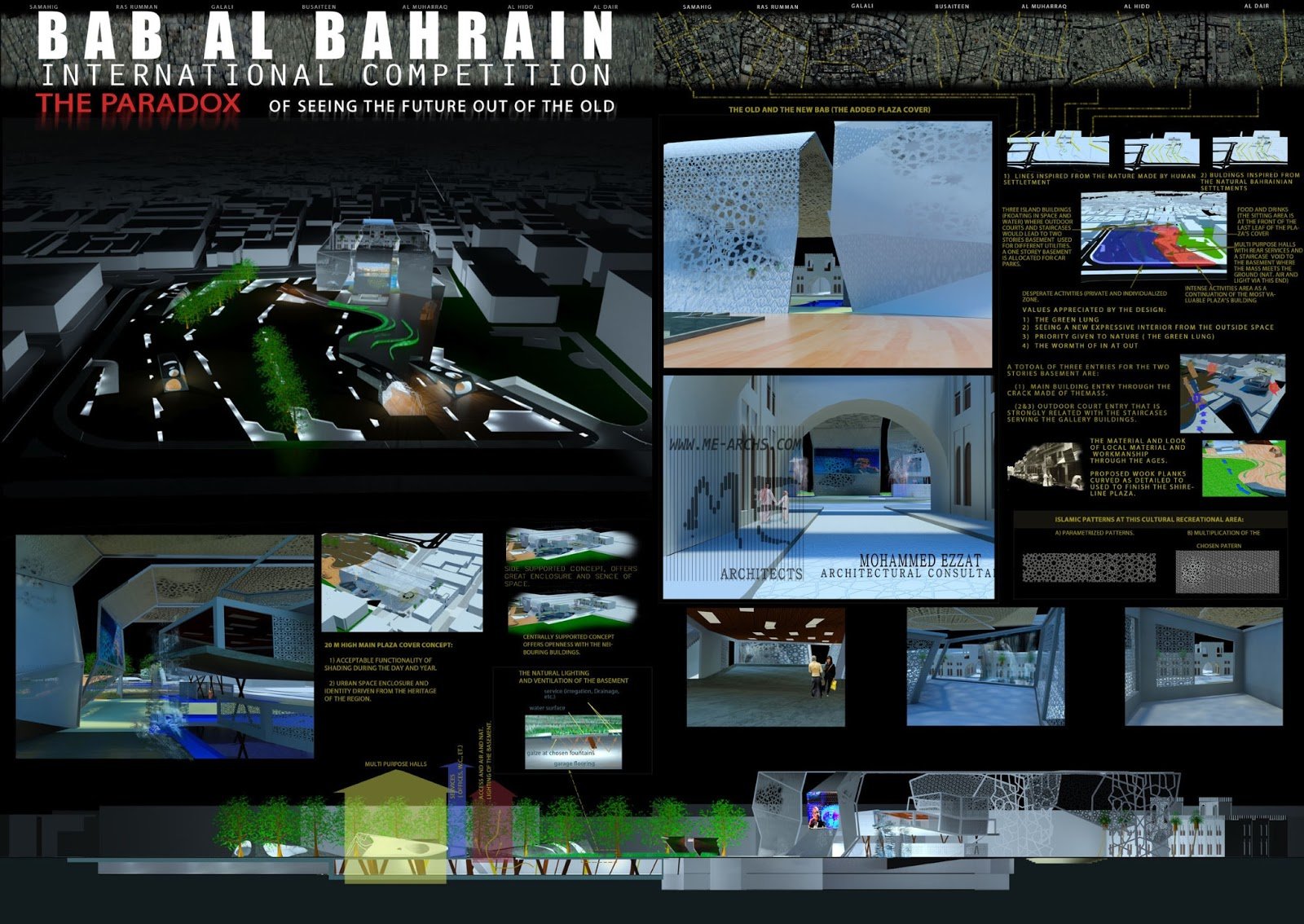 THE MAIN IDEA WAS TO EXTEND THE EXISTING MOST KNOWN COMMERCIAL AVENUE IN EL-MANAMA, BAHRAIN. THIS EXTENSION WAS ACHIEVED BY BUILDING A HUGE NEEDED SHED THAT WILL HOST EVENTS AND THE MAIN TOW BUILDINGS WHICH WOULD EXTEND UNDER THE GROUND LEVEL. THE MAIN PLAZA WAS LEFT MOSTLY OPEN BECAUSE THE NEED FOR OPEN SPACES IN THE CAPITAL.